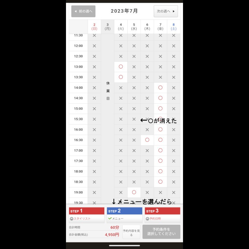 しかし、ここで30分を超えるメニューをSTEP2で選択すると次の予約とのブッキングを防ぐため予約不可の×が表示されます。